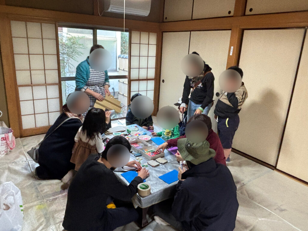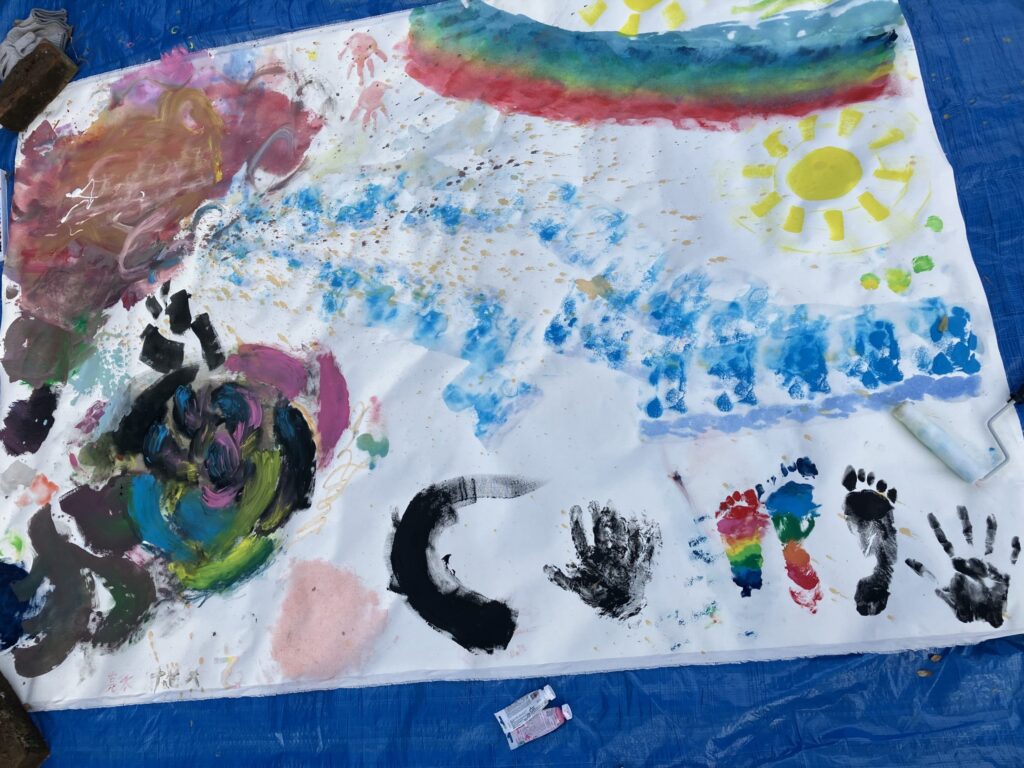 工作では大きい真っ白な布に、自分の作ったハンコを押したり、絵を描いたり…。素足に絵具を塗って押している人もいて楽しそうでした!
