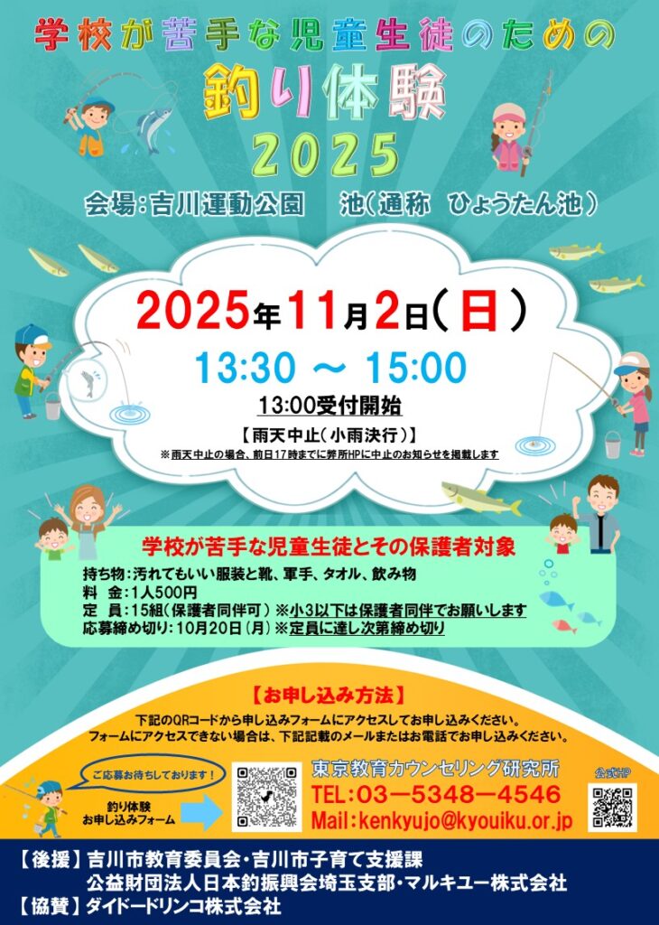 東京教育カウンセリング研究所初の釣り体験イベントを11月2日(日)吉川運動公園にて行います!