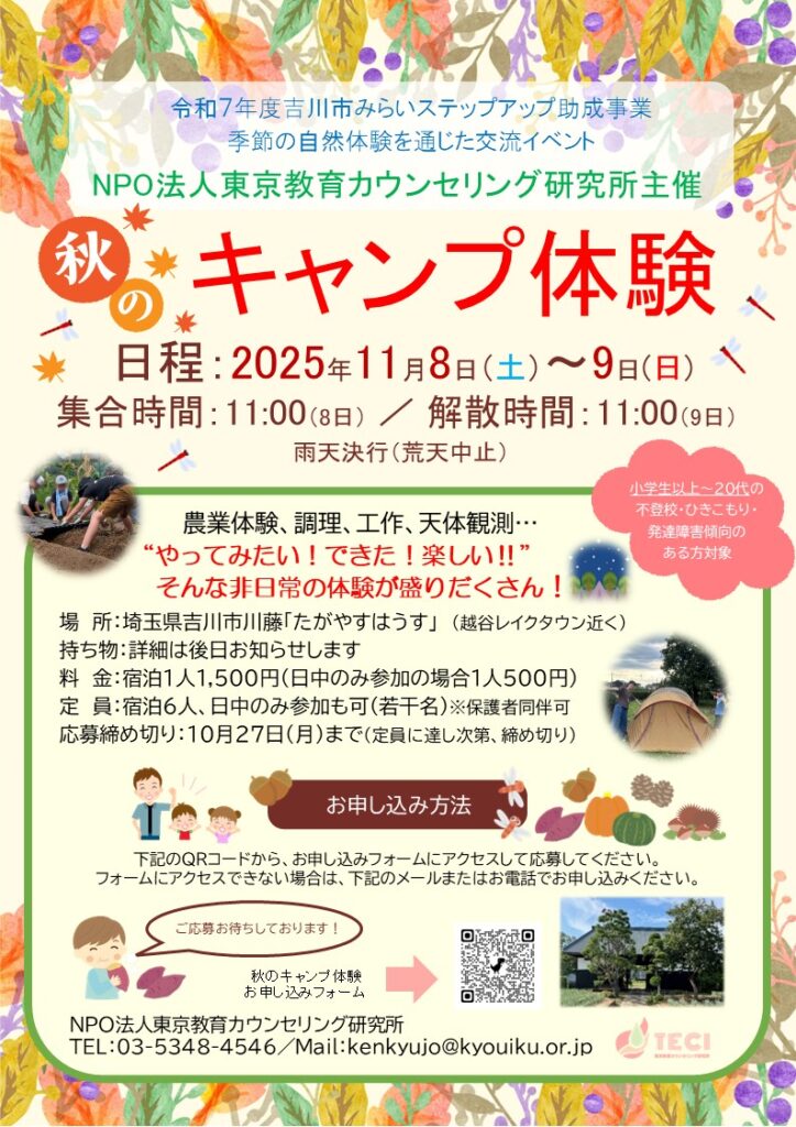 11月8日(土)~9日(日)「秋のキャンプ体験」開催のお知らせ!